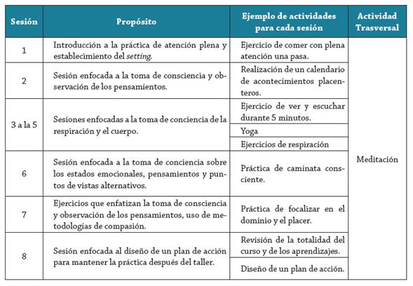 Se realizó una intervención de 8 sesiones basada en la metodología de mindfulness para la reducción del estrés de acuerdo con lo propuesto por Shapiro y Carlson 7. En la tabla 1 se detallan las sesiones de la intervención. Cada sesión fue guiada por psicólogos expertos en esta técnica.