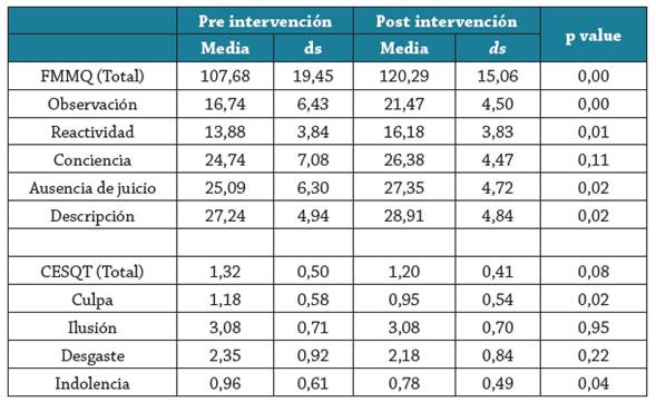 Luego de la intervención se apreció un incremento significativo del nivel de atención plena de los participantes (p<0.001), equivalente a un promedio de 12,62 puntos (ds=16,61) (tabla 2). Lo mismo se observó al analizar cada una de las dimensiones del FFMQ. Solo el nivel de conciencia no se incrementó significativamente (p=0,11).
