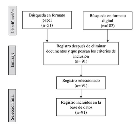 Extracción de los datos: Se excluyó el duplicado de las tesis encontradas (por reglamento interno, si la tesis de pregrado tiene nota >6.0 en una escala de 1.0 - 7.0, se conserva una copia en cada biblioteca). No se aplicaron criterios de exclusión por tipo de estudio e idioma (todas fueron redactadas en español). La muestra final fue de 91 tesis (figura 1).