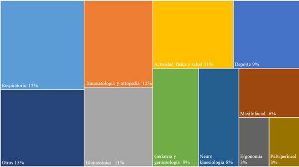 Se evidenció que las tesis mayoritariamente eran investigaciones originales (98,9 %), solo un 1,1 % fueron revisiones, eran desarrolladas por dos estudiantes (89 %), con un profesor guía de grado académico licenciado (69,2 %) o magíster (20,9 %). Las áreas de la kinesiología más investigadas fueron la respiratoria (15 %) y traumatológica (12 %). En relación con las áreas no reconocidas por el Departamento de Acreditación de Especialidades y Especialistas de Kinesiología (DENAKE) (8), destacaron la biomecánica, ergonomía, maxilofacial y actividad física y salud como áreas emergentes (31 % en su suma total) (figura 2).