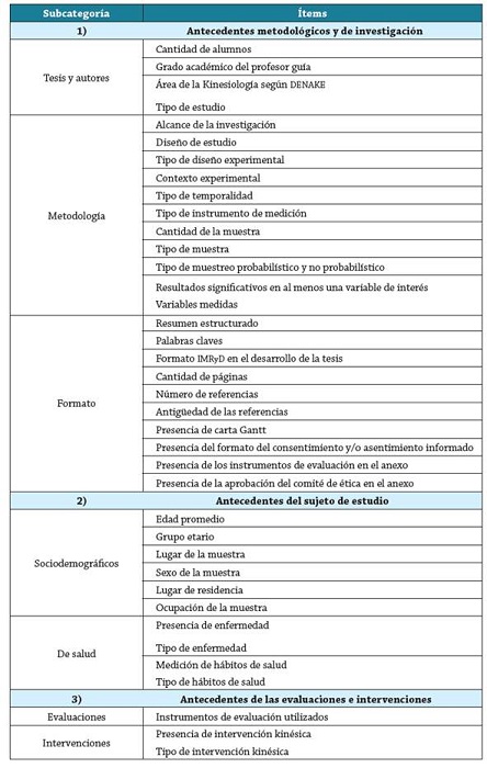 Se utilizó un instrumento de registro con 38 ítems, el cual fue validado por tres expertos en las áreas de metodología, investigación y análisis bibliométrico previo a la toma de datos. Cada uno de los expertos hizo recomendaciones y sugerencias de mejora en relación con la congruencia de los ítems, la amplitud de contenidos, la redacción de los ítems, la claridad y precisión de los ítems y la pertinencia de los ítems. Las recomendaciones fueron incorporadas en la versión final del instrumento. El instrumento se organizó en tres grandes categorías y cada una fue subdividida en subcategorías e ítems: 1) antecedentes metodológicos y de investigación, contenía tres subcategorías: a) antecedentes generales de tesis y autores, con 4 ítems, b) metodología, con 11 ítems, y c) formato, con 10 ítems; 2) antecedentes del sujeto de estudio, con dos subcategorías: a) sociodemográficos, con 6 ítems, y b) de salud, con 4 ítems, y finalmente 3) antecedentes de las evaluaciones e intervenciones, con dos subcategorías: a) evaluaciones, con 1 ítem, y b) intervenciones, con 2 ítems (tabla 1). Específicamente, las subcategorías de 1.a) antecedentes generales de las tesis y autores y 1.b) metodología contenían ítems específicos de acuerdo con la literatura de esta área (28, 29).