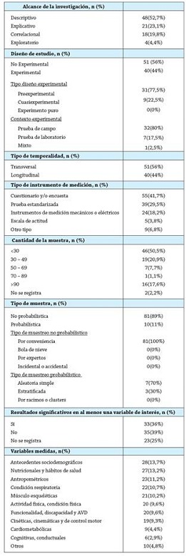 Materials and methodology: 91 theses were analyzed, using a validated instrument organized in three categories: methodological and research characteristics, records of the participants, and records of the evaluations and interventions. The said instrument consisted of a total of 38 items.