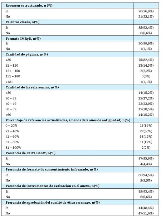 Se observó que un alto porcentaje de las tesis presentaban un resumen estructurado, la presencia de palabras claves y escritas en un formato IMRyD (Introducción, Metodología, Resultados y Discusión) (76,9 %, 93,4 % y 98,9 %, respectivamente). Por otro lado, tenían < de 80 hojas, < de 49 referencias (82,4 y 66,3 %, respectivamente) y el 86 % tenía < 60% de sus referencias actualizadas (menor a 5 años). Finalmente, solo un 48,4 % registró la aprobación de un comité de ética; por el contrario, un alto porcentaje registró los instrumentos de evaluación y su consentimiento informado en el anexo (93,4 y 94,5 %, respectivamente) (tabla 3).