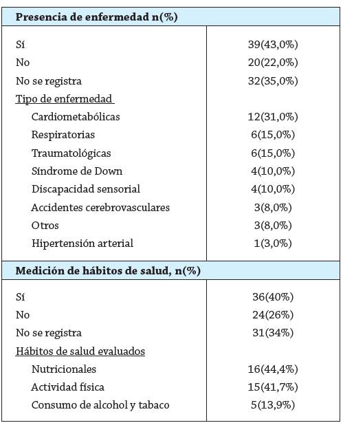 En la tabla 5 se presentan los datos de la subcategoría antecedentes de salud del sujeto de estudio. Las tesis investigaban generalmente a personas con un diagnóstico médico (43 %), y las patologías cardiometabólicas, respiratorias y traumatológicas eran las más frecuentes (31 %, 15 % y 15%). Adi-cionalmente, el 40 % de las tesis evalúo hábitos de salud, siendo los hábitos nutricionales, de actividad física y de consumo de tabaco y alcohol los evaluados (44,4 %, 41,7 % y 13,9 %, respectivamente).