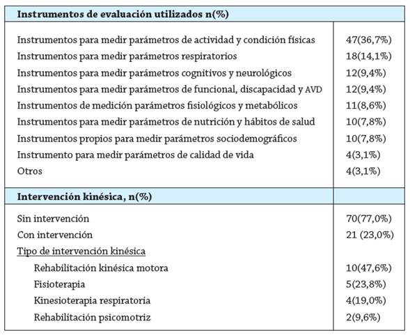 En la tabla 6 se presentan los datos relacionados con la categoría antecedentes de las evaluaciones e intervenciones. Predominaban los instrumentos que evaluaban actividad y/o condición física y parámetros respiratorios (36,7 y 14,1 %). Por último, el 77 % de las tesis no realizaron intervenciones kinésicas; las que sí realizaron correspondían al ámbito motor.