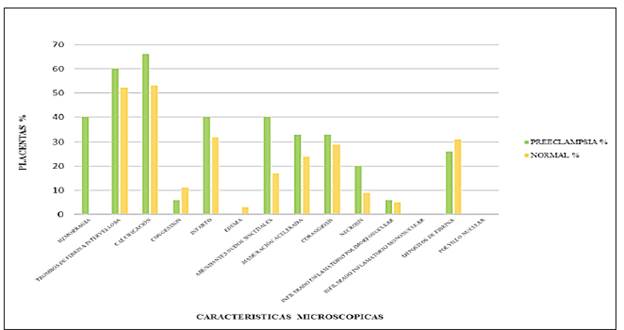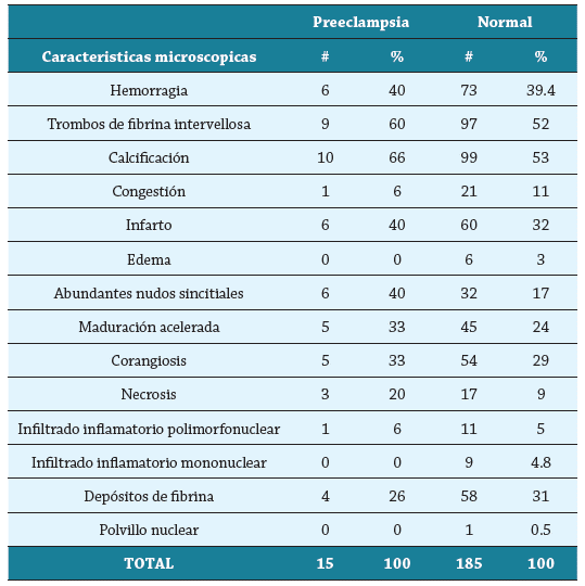 A nivel microscópico se observaron trombos de fibrina en un 52 %, hemorragia intervellosa en un 39.4 %, corangiosis en un 29 %, calcificaciones en un 53 %, infartos en un 32 %; así mismo, se encontró zonas maduras en un 2 4 %, infiltrado inflamatorio mononuclear en un 4.5%, infiltrado inflamatorio de polimorfonucleares en un 5 %, necrosis en un 9 %, y otras características, como edema en un 3 %, congestión en 11 %, depósitos de fibrina a nivel prevellositario en 31 % y estructuras vasculares con polvillo nuclear en un 0,5 %, en las placentas sanas.