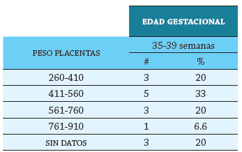 Se observó que el 100 % de las placentas preeclampticas se encuentran en edades a término, de las cuales 20 % presentan pesos entre 260 y 410 gramos, 33 % entre 411-560, y 20 % entre 561-760. Es importante resaltar que un porcentaje menor (6.6 %) sobrepasa el peso normal que debe tener una placenta a término (aproximadamente 400-600 gramos) (ver tabla 2).
