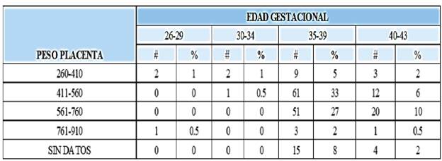 En las placentas sanas estudiadas se encontró que 139 (75 %), tienen una edad gestacional comprendida entre las semanas 35-39, el 33 % representan un peso de 411-560 gramos y el 27 % entre 561-760, mientras que el 3 % de las placentas estudiados presentan una edad gestacional menor de 34 semanas de gestación, con un peso entre 260-410 gramos. Además, 40 de las placentas sanas tienen una edad gestacional comprendida entre las semanas 40-43, el 10 % tiene un peso comprendido entre 561 y 760 gramos.