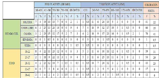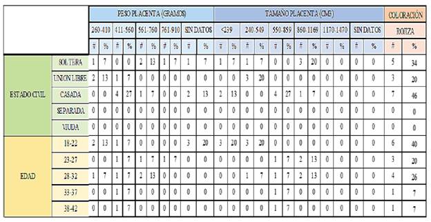 Analizando las variables sociodemográficas de las placentas sanas, se encontró que el estado civil más prevalente es casado, representado en un 41 %, con un rango de peso de 561-760, representa un 17 %, con un tamaño entre 550-859 cm3 correspondiente a un 20 %.
