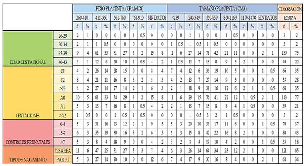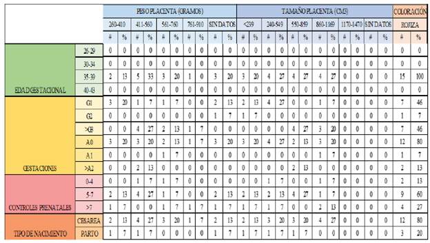Respecto a la coloración, se encontró que el 100 % de las placentas son de color rojizo, independientemente del tipo. Las variables de consistencia e implantación contempladas en los objetivos no pudieron ser reclutadas, debido a que el reporte de patología no proporcionaba esta información.