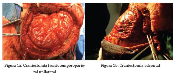 Tipo de incisión: En los casos de CD frontotemporoparietal unilateral y bilateral se utilizaron las incisiones de Penfield y Soutard, respectivamente; dos casos tuvieron variaciones en la técnica de incisión. En el primer caso se realizó inicialmente una CD unilateral, por lo que se utilizó la incisión de Penield, pero posteriormente fue llevado a CD del lado contrario, por lo que se amplió la incisión con técnica semisoutard. En el segundo caso, en el que se llevó a cabo una CD primaria unilateral izquierda, se realizó incisión semisoutard debido a la diástasis de una fractura con riesgo de lesión contenida del seno sagital. En la única CD bifrontal de la serie se empleó una incisión de Soutard.