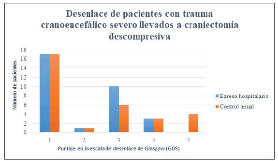 Resultados: Treinta y cinco pacientes con trauma craneoencefálico severo fueron sometidos a craniectomía descompresiva en el periodo de estudio, 29 primarias y 6 secundarias, con una latencia mediana de 5 horas y 57 horas, respectivamente. Se observó una sobrevida del 51,4 % de los pacientes, de los cuales 39 % presentó recuperación funcional satisfactoria en la escala de desenlace de Glasgow en el momento del egreso y al año.