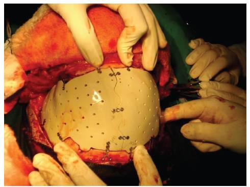 A los cuatro pacientes restantes se les implantó una craneoplastia con material sintético, ya que sus injertos habían sido desechados por encontrarse en condiciones que imposibilitaban su uso posterior. A dos pacientes se les implantó una craneoplastia sintética hecha a la medida en poliéter-éter-cetona (PEEK), incluyendo una paciente de 17 años con un gran defecto que comprometía la mayor parte de la bóveda craneana (figura 3). A los otros dos pacientes se les implantó una malla de titanio asociada a cemento óseo. Los implantes sintéticos también fueron fijados con placas y tornillos de titanio y el cierre se llevó a cabo con la técnica convencional por planos. El paciente que tenía el injerto óseo en un bolsillo de la pared abdominal falleció en el posoperatorio, por lo que no fue posible la realización de la craneoplastia ni la evaluación de la integración ósea del injerto.