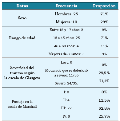 Treinta y cinco pacientes con TCES fueron sometidos a craniectomía descompresiva en la Clínica Universidad de La Sabana durante el período de enero de 2008 a diciembre de 2013. Se encontró una predominancia del sexo masculino, siendo más frecuentes los casos dentro del rango de edad de 18 a 45 años. Los datos demográficos se muestran en la tabla 1.
