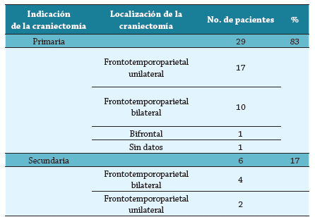 De los pacientes de la serie, 29 fueron llevados a craniectomía descompresiva primaria. Los 6 pacientes restantes fueron llevados a craniectomía descompresiva secundaria; cuatro de ellos se sometieron inicialmente a un drenaje de hematoma subdural o intracerebral, con colocación de ventriculostomía y monitoria de PIC y un paciente fue llevado solamente a ventriculostomía para manejo de hipertensión endocraneana. En los 6 casos se documentó hipertensión endocraneana refractaria pese al manejo médico, el drenaje quirúrgico de las colecciones y el drenaje de líquido cefalorraquídeo (LCR), por lo que se indicó la CD (tabla 2).