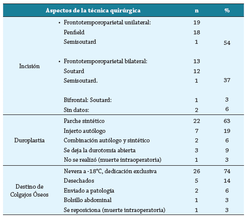 Con respecto a la técnica para la craneoplastia, la mayor parte (cinco pacientes) se realizó con material autólogo, es decir, el injerto óseo estéril que se había mantenido en congelación a -18°C. Dicho injerto fue sometido a un proceso de esterilización el día anterior a la craneoplastia mediante la técnica convencional de esterilización de implantes y pasado con técnica estéril a la mesa operatoria. El injerto se fijó al cráneo con placas y tornillos de titanio y se realizó un cierre por planos convencional. En todos los pacientes llevados a craneoplastia con injerto autólogo en la institución se observó en el largo plazo integración adecuada sin reabsorción del tejido óseo.