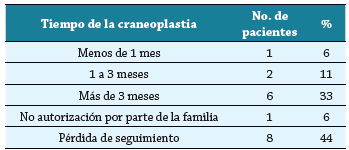 Craneoplastia: Nueve de los pacientes que continuaron su manejo en la institución fueron sometidos a este procedimiento, una vez se hubo documentado ausencia de infección sistémica o local en el sitio del defecto de craniectomía. En seis pacientes, la craneoplastia se realizó posterior a los tres meses de la CD, en dos casos entre uno y tres meses y en un caso antes de un mes (tabla 4). En el caso de una de las pacientes, la familia no autorizó la craneoplastia, y en los ocho pacientes restantes no fue posible determinar si fueron sometidos o no a craneoplastia o qué técnica y materiales pudieron haberse empleado para su realización, pese a que se intentó verificar esta información mediante seguimiento telefónico.