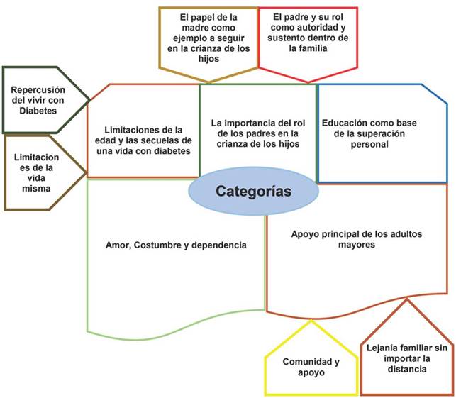 A continuación, se presentan las cinco categorías resultantes de las entrevistas realizadas, que determinan la importancia de las relaciones interpersonales y la capacidad de resiliencia de los individuos al momento de enfrentarse durante tanto tiempo a una enfermedad y sus secuelas: La importancia del rol de los padres en la crianza de los hijos; educación como base de la superación familiar; limitaciones de la edad y las secuelas de una vida con diabetes; amor, costumbre, dependencia y red de apoyo, pilar fundamental para el desarrollo de los adultos mayores. Las cuales serán descritas a continuación y su representación gráfica se encuentra en los anexos.
