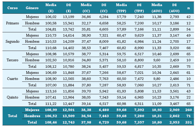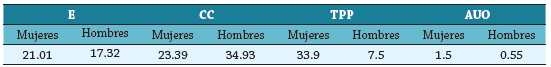 En la tabla 1 se presentan los resultados de la estimación de las medias, desviación estándar de la media y los tamaños de muestra en (E), cada uno de sus componentes y por género.