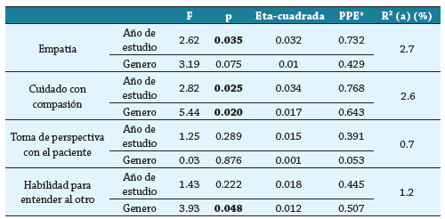 Se observó que (E) fue significativo (p=0.035); el factor curso, el valor de eta-cuadrado y la potencia observada fueron satisfactorios; la media de las mujeres fue de 108.99 y la de los hombres de 106.52, de un máximo de 140 puntos. En el componente CC fue significativo el factor Curso (p=0.025) y el Género (p=0.020). La media de las mujeres fue de 38.38 y de los hombres de 36.54 (máximo: 49 puntos); las mujeres presentan valores de este componente mayores que los hombres. En el componente TPP, así como en el componente AUO, se observó que los factores Curso, Género y la interacción entre ambos no fueron significativos (p>0.05), y los valores de eta-cuadra-do y de la potencia fueron relativamente bajos para ambos factores y también para la interacción entre ellos; en el primer caso, la media en las mujeres y hombres coincidieron: 59.68 (máximo de 70 puntos). En el componente AUO se encontró que las mujeres lograron una media de 11.53 y los hombres de 10.23 (máximo de 21 puntos). Los valores de R2 fueron bajos. El mayor de ellos fue de 0.027, es decir, qué en el caso de la empatía, los factores estudiados solo explican un 2.7 % de la variabilidad contenida en los datos observados para la empatía. La misma interpretación se aplica a cada uno de sus componentes.