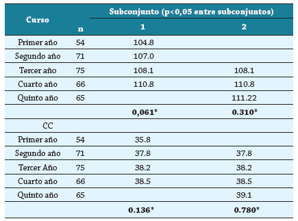 En la empatía se observa la formación de dos grupos (con valores ascendentes): el primer año es el que tiene el menor valor, luego aumentan (no correlativamente) en segundo, tercero y cuarto, pero sin que existan diferencias significativas entre ellas (p=0.061). El segundo grupo está constituido por las medias desde segundo a quinto año y no existen diferencias significativas entre ellas (p=0.31). Lo antes expresado indica que las únicas diferencias que existen son entre la media de primer y la de quinto año (p<0.05), y este componente se comportó de forma análoga al de la empatía. Se forman dos grupos bien definidos (con valores ascendentes) y con la misma distribución que en la empatía. Las diferencias esenciales están entre el primer y el quinto año, con diferencias significativas (p<0.05). En relación con la TPP y AUO, como fue expresado, no existen diferencias dentro de los factores estudiados.