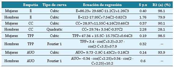 Todas estas estimaciones se realizaron con los datos de las medias estandarizados. Los valores de Sy.x son bajos y los valores de R2(a) son altos en la mayoría de los casos, lo que muestra que el modelo obtenido se ajusta a los datos en forma adecuada. Las medias se ajustaron a las formas cúbicas con mayor frecuencia, salvo pequeñas excepciones, entre ellas la distribución de Fourier 1.