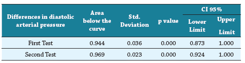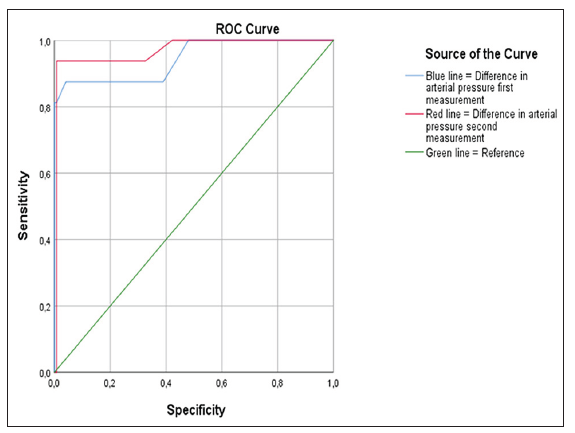 In this study, the ROC curve was determined at 0.944 and 0.969 for the first and second measurements, respectively, and it was found to be statistically significant at the p <0.05 level (see Figure 1). The asymptotic significance was p = 0.000, resulting in statistically significant results. In the coordinates obtained in the ROC curve for a cut-off point in the first measurement of 20 mm Hg of diastolic blood pressure difference, there was a sensitivity of 60% and a specificity of 95%, being the highest, compared to the second measurement.