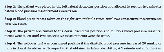 An automatic blood pressure monitor, with a universal cuff that covers arm circumferences of 22 - 42cm, was used in the study. Each pregnant woman was given the roll-over test as described in Table 1. After performing the two measurements, the woman was followed until the end of pregnancy and the immediate postnatal period to evaluate the development of pre-eclampsia. The data were analyzed using the SPSS statistical package.