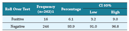 Results: The prevalence of the roll-over test in this study was 9%, with a 95% confidence interval (5.43 - 12.22). In this study, the ROC curve was determined (0.725 and 0.734, for the first and second measurements, respectively) and found to be statistically significant at the p <0.05 level. The sensitivity of the roll-over test for a cutoff point of 20 mmHg was 60%, and the specificity of 95% also had a PPV of 37% and a NPV of 98%. Differences between the first and second measurements suggest that the second measurement is more sensitive than the first one.