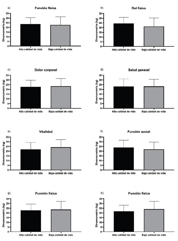 Los parámetros del algoritmo de la EWGSOP2 para el diagnóstico de sarcopenia se analizaron en forma independiente. Se evidenció que al comparar la fuerza muscular, medida con dinamometría, entre los grupos que tienen buena calidad de vida y mala calidad de vida, no se encontraron diferencias significativas en ninguna de las dimensiones del SF-36 (Figura 1).
