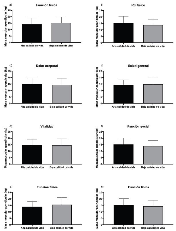 En la figura 2 se presenta la masa apendicular según nivel de calidad de vida. Al comparar la masa muscular apendicular entre los grupos que tienen buena calidad de vida y mala calidad de vida, no se encontraron diferencias significativas en ninguna de las dimensiones del SF-36 (Figura 2).