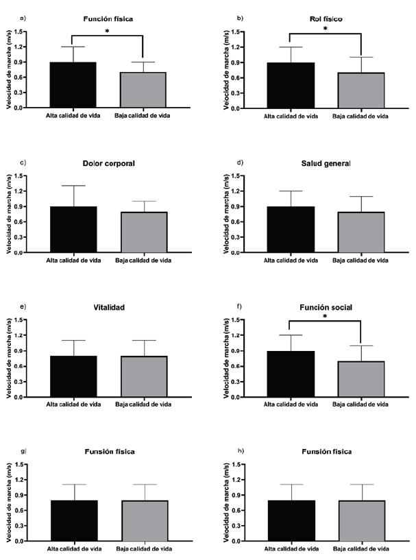 Por otro lado, en la figura 3 se observa la velocidad de marcha de las personas mayores según nivel de calidad de vida. Al comparar la velocidad de marcha entre los grupos que tienen buena calidad de vida y mala calidad de vida, se encontró que las PM que tenían una buena calidad de vida en la Función física (09±0,3 m/s versus 0,7±0,2 m/s, p=0,000), en el Rol físico (0,9±0,3 m/s versus 0,7±0,3 m/s, p=0,007) y en la Función social (0,9±0,3 m/s versus 0,7±0,3 m/s, p=0,040) tenían significativamente mayor velocidad de marcha en comparación con las PM que tenían una baja calidad de vida (Figura 3).