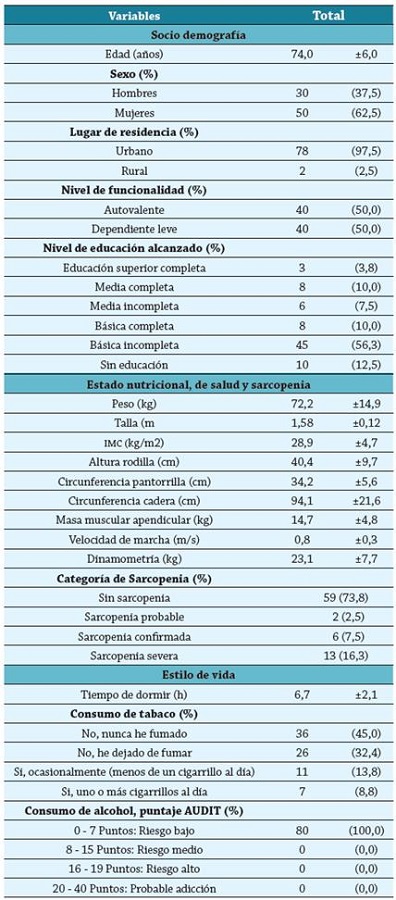 Se observó que la edad de la muestra fue 74,0 ± 6,0. Se evidenció que la muestra era mayormente compuesta por mujeres (62,5 %), tenían un lugar de residencia urbano (97,5 %), poseían educación básica incompleta (56,3 %) y el IMC promedio de la muestra fue de 28,9 kg/m2, categorizándose como sobrepeso. Con respecto al hábito del consumo de tabaco, el 45,0 % nunca ha fumado, mientras que el 8,8 % consume uno o más cigarrillos al día. En relación con el consumo de alcohol, el 100 % de la muestra presentó un bajo riesgo, según el índice AUDIT. Además, se apreció que el 73,8 % no presenta sarcopenia, y el porcentaje que posee algún grado de sarcopenia alcanza al 26,2 %, representando a la sarcopenia probable, la sarcopenia confirmada y la sarcopenia severa.