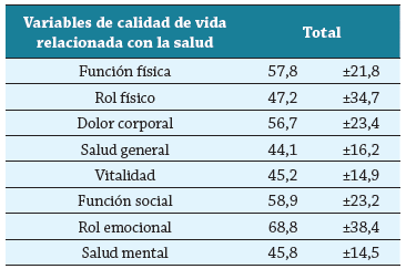 En la tabla 2 se puede observar la calidad de vida relacionadas con la salud medida con el SF-36 en las PM evaluadas. Los puntajes más bajos se evidenciaron en las dimensiones Rol físico, con 47,2; Salud general, con un 44,1; Vitalidad, con un 45,2 y Salud mental con un 45,8.