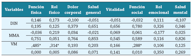Estas diferencias en el rendimiento físico entre las PM con alta y baja calidad de vida fueron corroboradas en el análisis de correlación de Pearson. Se observó que la velocidad de marcha presentó una correlación débil y positiva con las dimensiones de Función física, Rol físico y Runción social del SF-36, lo que implica que a medida que las PM aumentaron su velocidad de marcha, aumentaron, a la vez, sus puntajes en la Función física (p=0,000), Rol físico (p=0,005) y Función social (p=0,010) (Tabla 3).