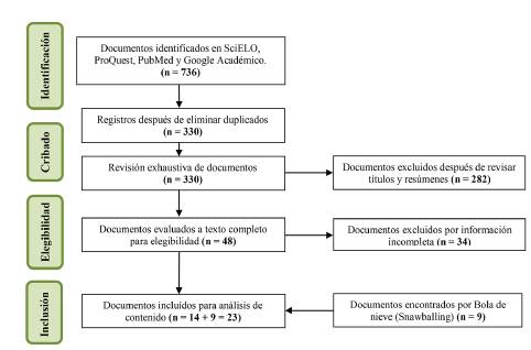 Materiales y método: Se llevó a cabo una revisión sistemática de la literatura en las siguientes bases de datos: PubMed (MedLine), ProQuest, SciELO y Google Académico, utilizando descriptores clave, criterios de selección y límites de búsqueda durante el proceso de revisión. Veintitrés documentos fue el insumo final seleccionado para el análisis.