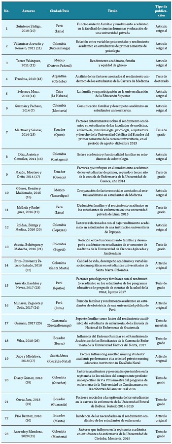 Latinoamérica es una de las regiones del mundo que se ha interesado por indagar acerca de este fenómeno, destacándose Colombia, Ecuador y Perú con el mayor número de estudios dentro de esta revisión. Hallazgo que llama la atención porque según Sánchez y Bote 33, algunos países europeos gozan de modelos familistas de reconocida tradición, por lo cual se podría esperar que el fenómeno del rendimiento académico influenciado por las dinámicas familiares tuviera un resultado significativo desde estos países.