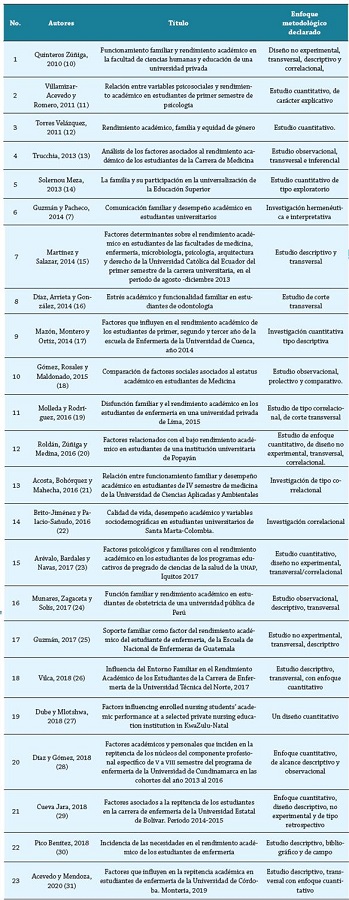 Al revisar los abordajes metodológicos, llama la atención que 22 estudios tuvieron abordajes desde el paradigma de investigación cuantitativa y solo uno evidenció haber abordado el fenómeno de la funcionalidad familiar y el rendimiento académico desde una perspectiva cualitativa, a través de un diseño hermenéutico e interpretativo (tabla 2).