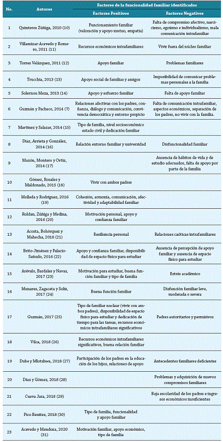 Results: in addition to the descriptive findings of the studies, positive and negative factors emerged that constitute explanatory categories of the existing association between family functionality and academic performance in health sciences students in higher education.