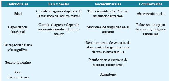 Se han identificado diversos factores predisponentes tanto en el adulto mayor como en el abusador asociados a un mayor riesgo de padecer algún tipo de maltrato 20. De forma general, la OMS propuso una clasificación relacionada con estos factores de riesgo, expresada en cuatro grupos grandes: factores relacionales, individuales, socioculturales y comunitarios 6 (tabla 1). Se han identificado mayor número de casos en la población femenina, mayor en afroamericanos que hispanos, pero menor en latinos. En una encuesta reciente realizada por la OMS a enfermeros en hogares geriátricos en Estados Unidos se encontró mayor proporción de abuso en mujeres, con una prevalencia de 17 % vs 10,9 % respecto al género masculino 9. Las mujeres tienen 6,1 % más probabilidades de ser abusadas que los hombres por varias razones. Entre estas se atribuyen la mayor expectativa de vida, mayor pérdida de independencia para realización de sus actividades básicas cotidianas y mayor deterioro cognitivo 14. Además, según refiere la literatura, son socialmente más capacitadas para soportar maltrato, ya que se asocia a una violencia transgene-racional principalmente por parte del cónyuge 14.
