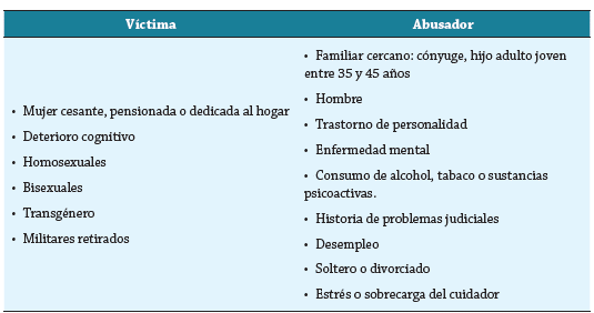 El entorno familiar resulta ser uno de los mayores factores de riesgo para agresión y vulnerabilidad en el anciano, por el simple de hecho de compartir la vivienda con el posible agresor 6,23. Entre las características más representativas del abusador (tabla 2) se identifica que en la mayoría de los casos es un familiar cercano, típicamente un hombre, independientemente del género de la víctima 9,24,25. En una revisión bibliográfica sobre maltrato y abuso en el adulto mayor realizada en 2017 por la Asociación Costarricense de Medicina Legal y Disciplinas Afines se encontró que "el agresor más prevalente es el cónyuge, seguido del hijo adulto joven entre 35 y 45 años de edad, desconocidos, hermanos y vecinos" 26. En Colombia, se ha identificado que por lo general el abusador es el hijo varón mayor de 40 años de edad 23.