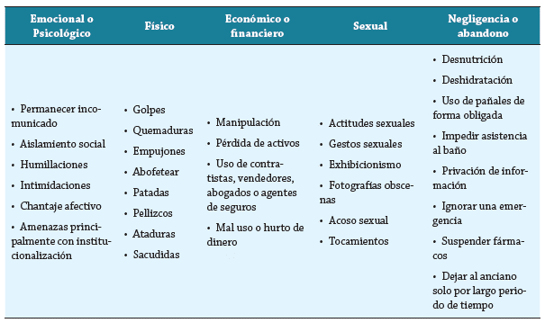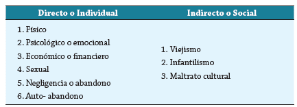 En la cartilla del buen trato al adulto mayor del Ministerio de Salud de Colombia, publicada en agosto de 2018, se hace referencia a dos grupos principales: el maltrato Directo o Individual y el Indirecto o Social (tabla 3), y cada una de sus manifestaciones y formas de presentación (tabla 4) 6,30.