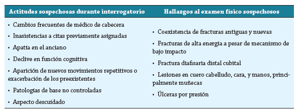 Durante la consulta externa es importante tener en mente la importancia de realizar el interrogatorio en privado y, de ser posible, atender al paciente y al cuidador por separado 40. Se pueden identificar signos de alarma durante la entrevista y en el examen físico (tabla 5) que pueden orientar hacia algún tipo de abuso específico, pues, en la mayoría de los casos las patologías y co-morbilidades en este ciclo vital suelen enmascararlo 5. Entre los hallazgos físicos se encuentran, con prevalencia hasta del 43,98 %, lesiones en extremidades superiores, contusiones y abrasiones en región axilar, cara interna de muslos y dorso de pies 41.
