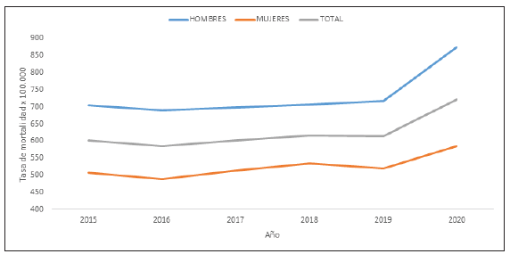 La tasa de mortalidad bruta (por todas las causas) fue superior en hombres, con una razón promedio de 1,39:1. Gráficamente es notorio el exceso de mortalidad para 2020 en comparación con el comportamiento de la mortalidad entre 2015 y 2019, y fue superior el cambio en hombres (gráfica 1).