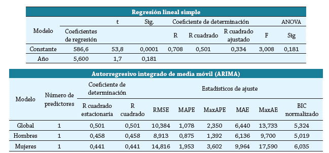 Para estimar la tasa de mortalidad esperada para 2020, a partir de los datos 2015-2019 se utilizaron, además de la media aritmética, dos modelos: una regresión lineal simple y un modelo ARIMA de serie de tiempo; tomando como variable dependiente la tasa de mortalidad y como predictor el tiempo, estos reportaron niveles adecuados para hacer la predicción de la carga de mortalidad (tabla 1).