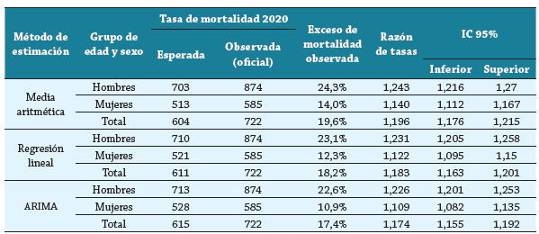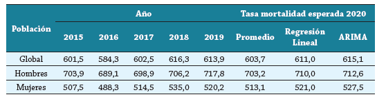 Para estimar la tasa de mortalidad esperada en 2020 se utilizaron tres métodos: la media aritmética, la regresión lineal y un modelo autorregresivo de medias móviles (ARIMA) global y específico por sexo, y se tomó como variable dependiente la tasa de mortalidad anual y como variable independiente el año o periodo.