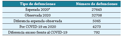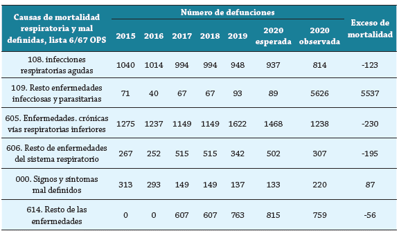 Dado que la lista de causas 6/67 de la OPS no tiene una categoría específica para COVID-19, la posible categoría en la que se registró la mortalidad por el virus fue la "110: Otras enfermedades infecciosas y parasitarias", que reportó un exceso de mortalidad observada frente a la esperada de 5626 defunciones; el resto de causas de mortalidad respiratorias registró por el contrario, un decremento de 123 a 230 defunciones, y entre las causas mal definidas se registró un aumento de los signos y síntomas mal definidos y una disminución en el resto de las enfermedades (tabla 5).