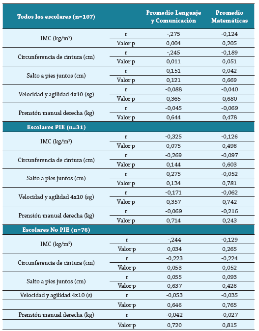 Adicionalmente, cuando se relacionó el IMC, circunferencia de cintura y variables de condición física con el rendimiento en las asignaturas de Lenguaje y Comunicación y Matemáticas en los escolares PIE y en los No PIE se evidenció una asociación significativa y negativa entre el IMC, la circunferencia de cintura y el promedio de notas en lenguaje y comunicación (r=-0,275; p=0,004; r=-0,245, p=0,011). En particular el grupo No PIE presentó una asociación significativa inversamente proporcional para la variable IMC y promedio de notas en lenguaje y comunicación (r=-0,244, p=0,034). En los escolares que participan del PIE no se observaron asociaciones significativas entre las variables estudiadas (tabla 3).