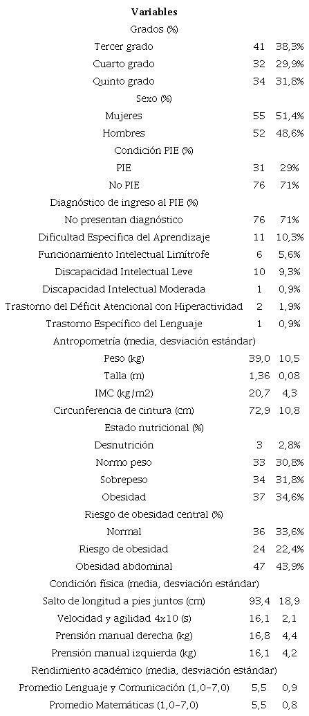 En la tabla 1 se presentan datos de caracterización del total de la muestra estudiada (n=107). Se evidencian valores promedio elevados de IMC (20,7 kg/m2), donde un 66,4 % de los estudiantes presenta sobrepeso y obesidad. Para la variable circunferencia de cintura se observa una media de 72,89 cm, donde un 43,9 % de los escolares se encuentra en estado de obesidad abdominal. Además, un 29 % del total de la muestra pertenece a un programa de integración escolar (PIE). Los diagnósticos de ingreso al PIE que presentaron mayor frecuencia fueron dificultad especifica del aprendizaje y discapacidad intelectual leve.