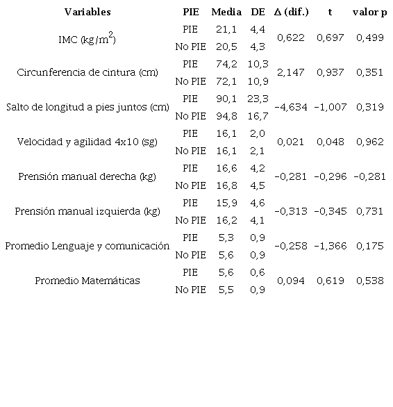 Al comparar los escolares del PIE y (n=31) y No PIE (n=76) no se observaron diferencias para las variables antropométricas, de condición física y rendimiento académico (tabla 2).